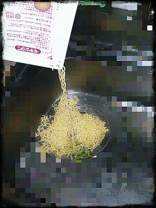 しっかり湯切り派の私は割と強めにぺヤングをシェイクしました。