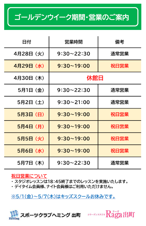 GW営業のご案内 | スポーツクラブ ヘミング出町