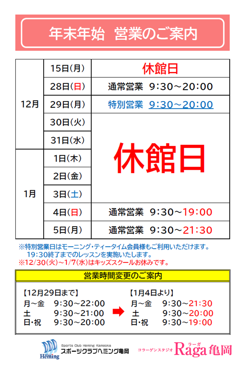 休館日毎月15日、毎月月末、夏季休館、年末年始、メンテナンス休館 他