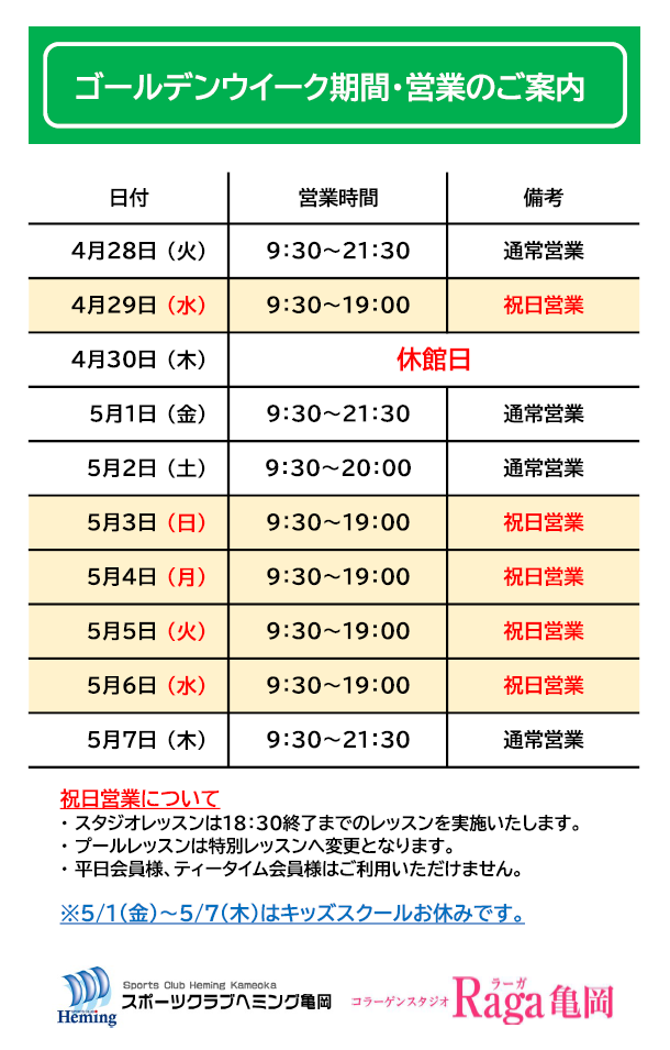 GW営業のお知らせ | スポーツクラブ ヘミング亀岡